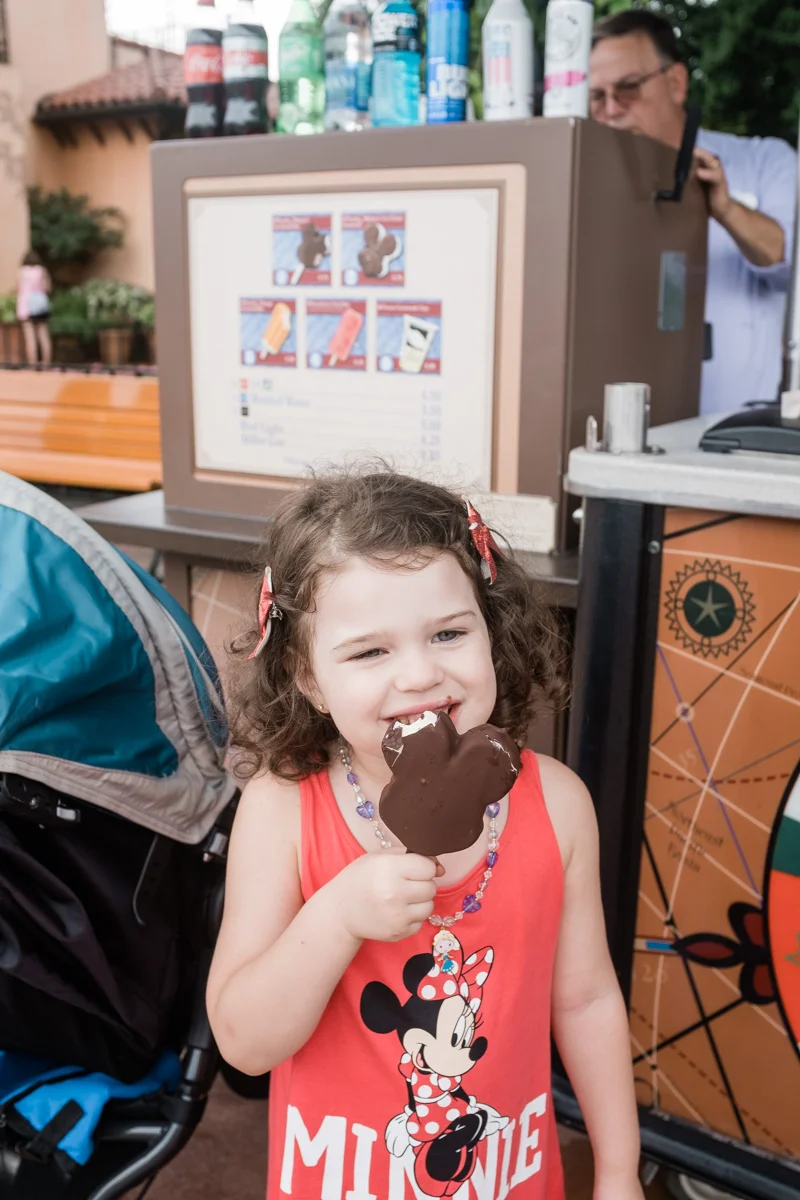 Mila has her first Mickey ice cream “on mickey mouse” thanks to the lady who opened the stand!
